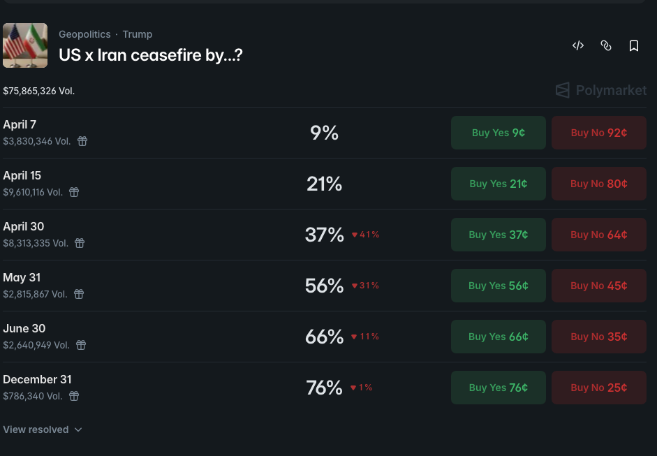 Considering that at least one Marines unit has an ETA of end of April, we can expect round 2 to last longer than round 1 (which lasted just over 3 weeks). The situation will be dynamic during that time and there are chances for de escalation, as well as escalation depending on the progress on both sides. Disclaimer: I also hold some longer dated No positions, however I bought them at the beginning of the conflict and for now I am comfortable holding them. Fair value of end of April ceasefire: 30% based on the current assessment, taking into account that the US might be quick to compromise in case of early failure in the escort operation.