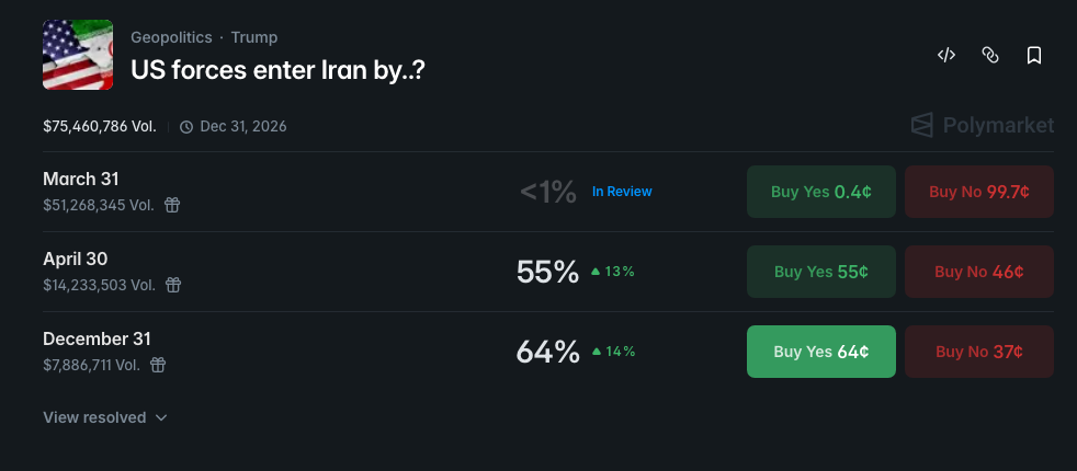 I believe that the regime’s ability to continue the confrontation is a proof of its resilience. I will only reassess my positions once I see larger US troops mobilization that will suggest a wider ground campaign. For now there are no signs of that thus fair value of No is at 80%