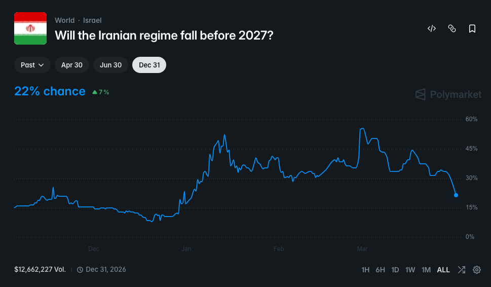 Lastly, I am still holding No shares on regime change in Iran by the end of the year: