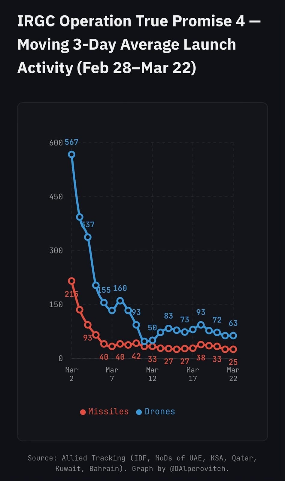 The US and Israel continue to claim that Iranian capabilities are almost entirely destroyed, but the constant level of launches per day seems to deny that.