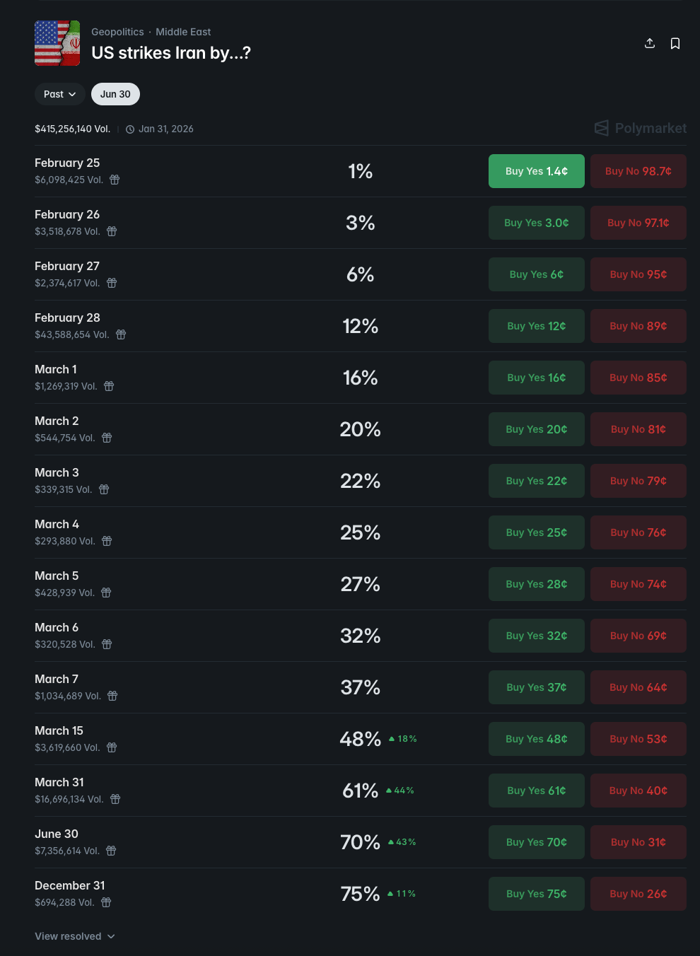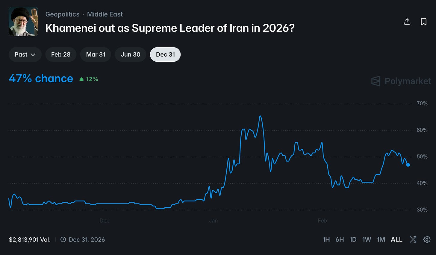 Additionally, I believe that Khamenei out market offers an interesting addition, as even in case of strikes, even when they would be directed at Khamenei, chances are he will be able to survive: