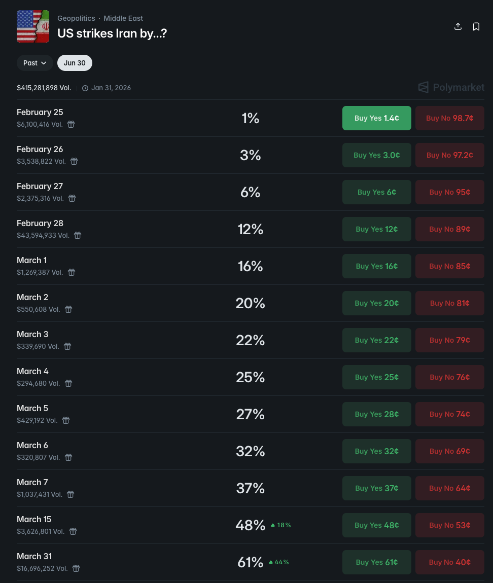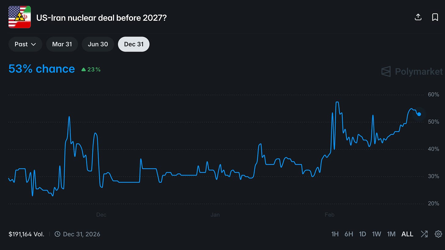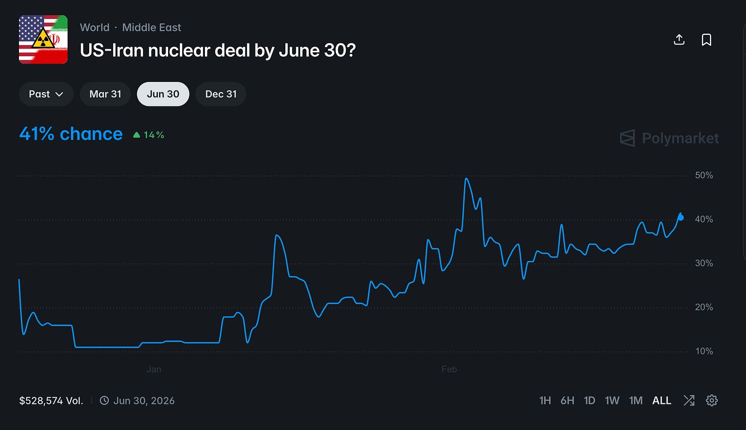 My X feed, mainstream media, my friends and my neighbors - there is one thing that connects them all. They all focus on the military buildup, on the next massive airlift, on when is the next strike. See it for yourself - here are two markets. One on the deal possibility and one on the strike possibility: