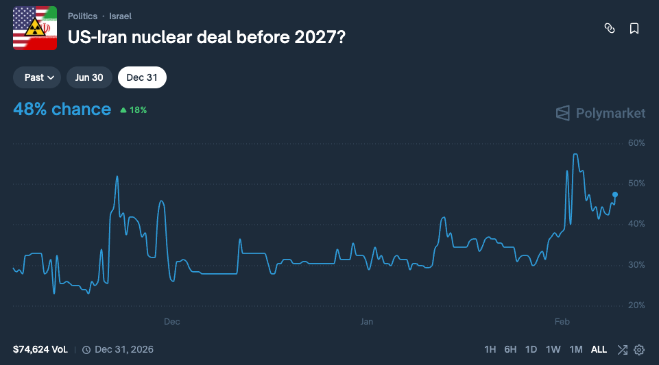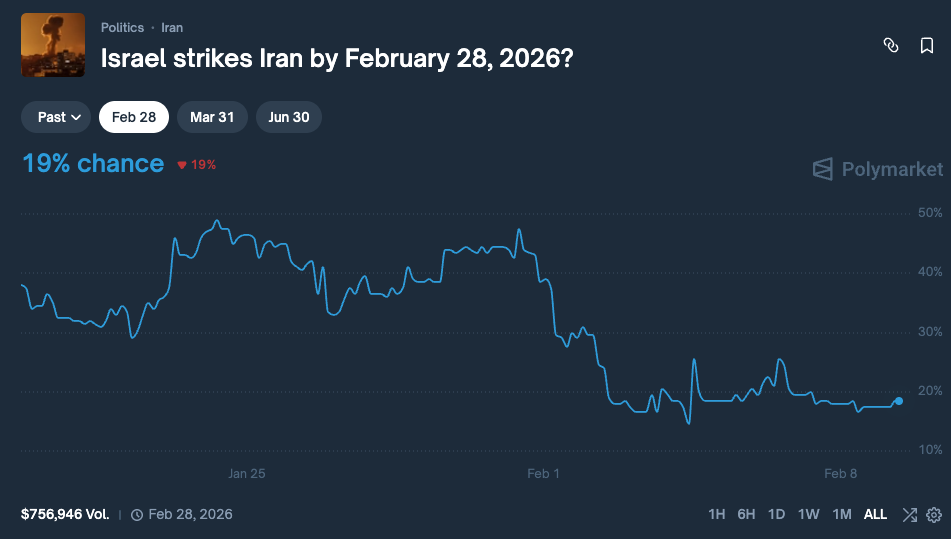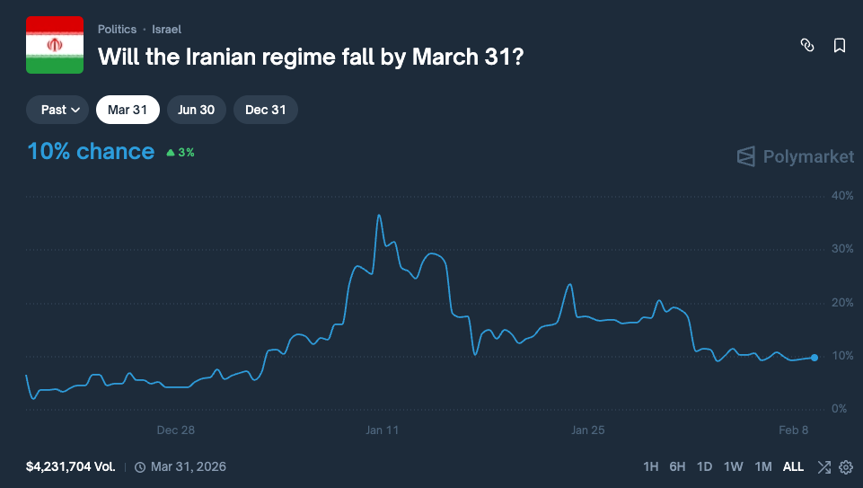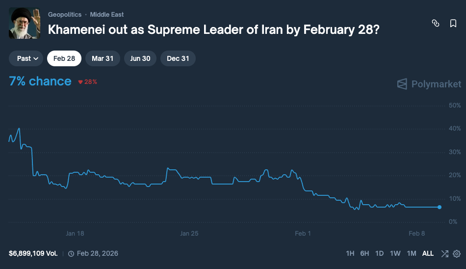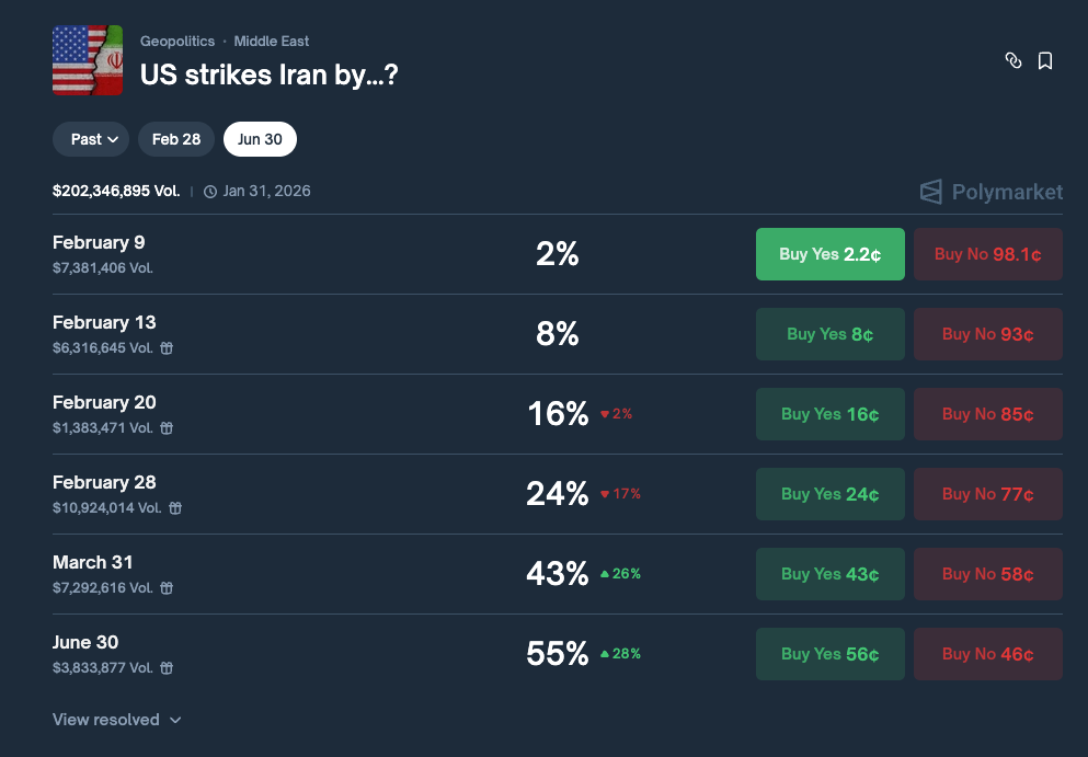Moving straight to markets, you can imagine that I’m on No side for US strikes in the short-term, as well as for Ayatollah out or regime out. I’m a buyer for end of February and end of March deadlines at this point as they offer the best APY and thus risk/reward profile. On the longer term the context can change, moving the prices significantly; my initial thesis here remains unchanged: