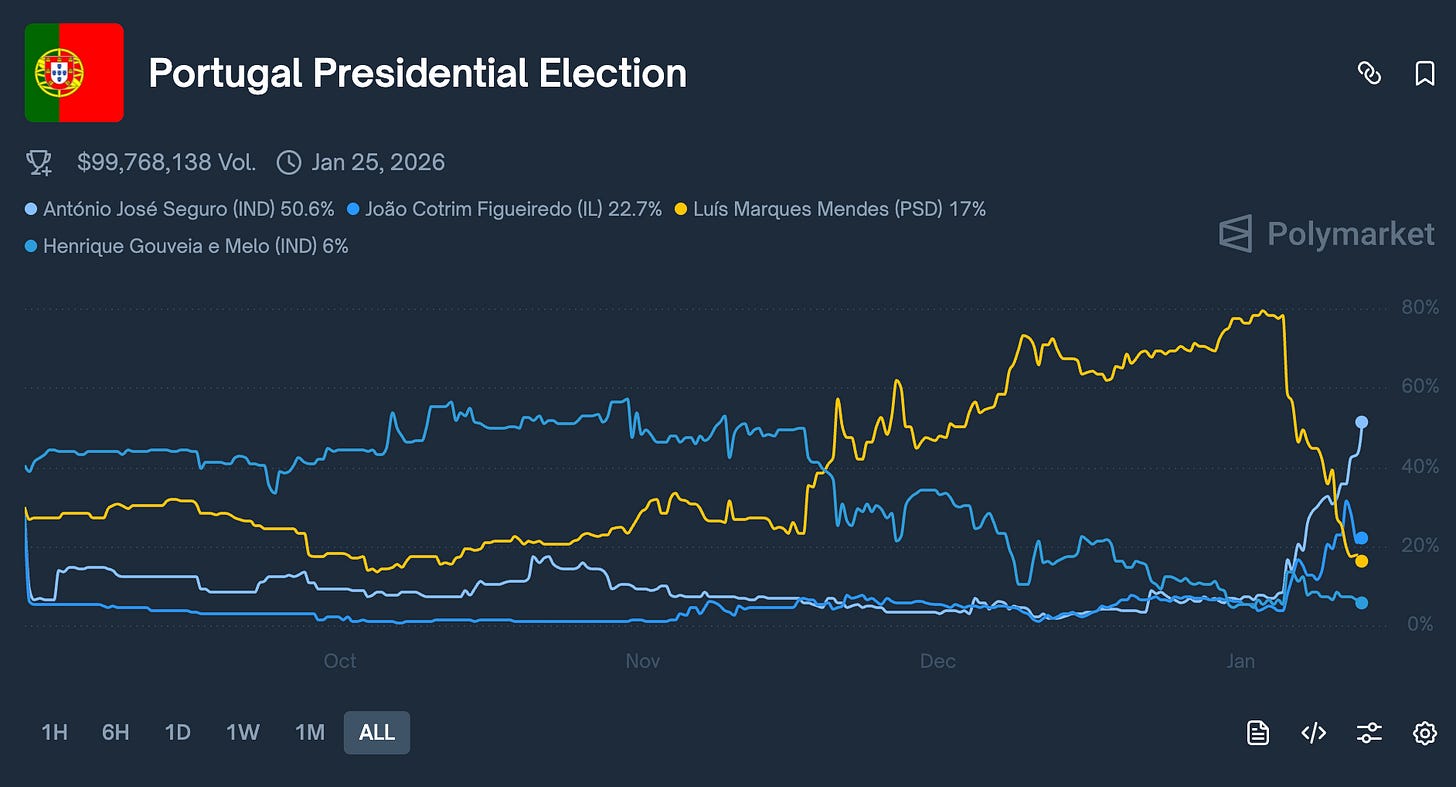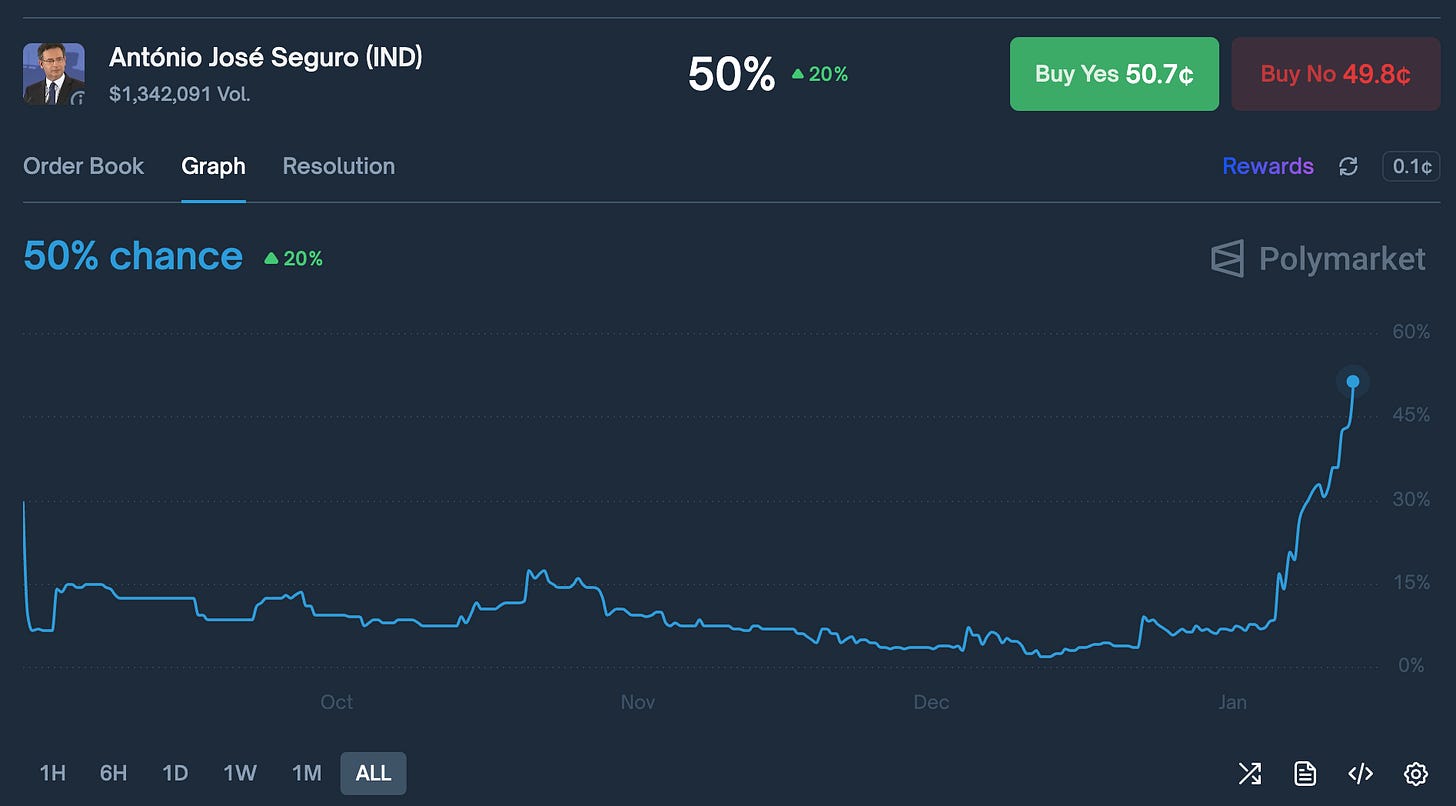 Looking broadly at the polls, we have 5 candidates that are likely to succeed, with only 2 spots for the second round. And I know many traders die on the hill of polls, but when I see a situation like this, I mostly dismiss them. Considering the margin of error, as well as structural changes to the political party system in Portugal, there is no way these pollsters are weighing their raw data correctly. Their samples are most likely outdated and not representative of the population.